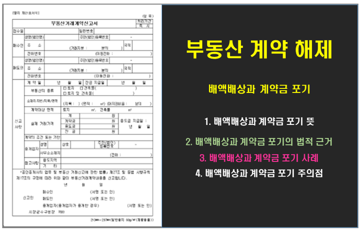 - 계약서 내용 확인 필수 - 계약서에 "계약 해제 시 계약금 반환 불가" 등의 조항이 포함될 수 있으므로 반드시 계약 내용을 확인해야 합니다. 배액배상 및 계약 포기와 관련된 조항을 명확히 기재해야 분쟁을 예방할 수 있습니다.