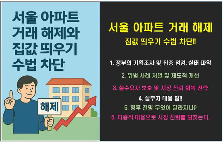 서울 아파트에서 발생하는 ‘신고가 거래 → 계약 해제’ 패턴은 단순한 통계적 현상이 아니라, 시장을 교란하고 실수요자에게 피해를 줄 수 있는 심각한 문제입니다. 정부의 기획조사·실거래 확인·위법 판별·엄벌 처분·제도 개선의 연속적 조치는 이 문제를 원천적으로 차단하기 위한 긴 여정의 시작이라 할 것입니다.