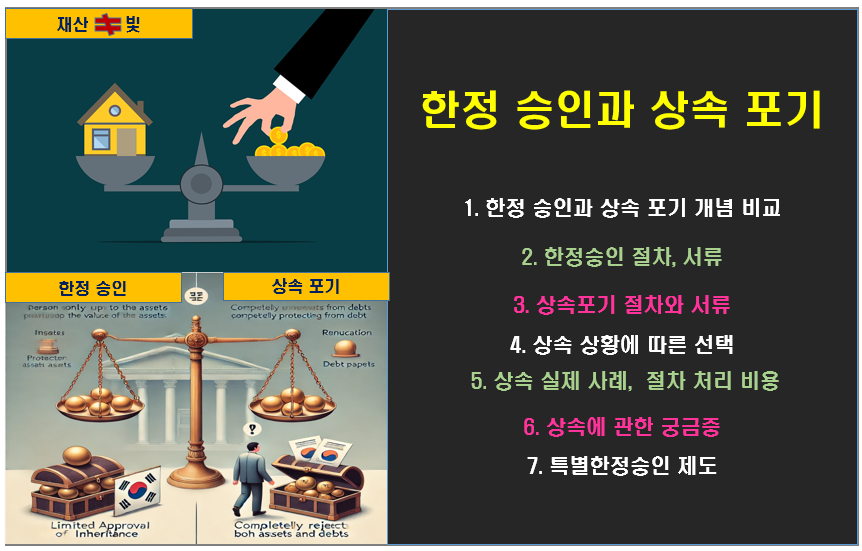 | 단점 | 절차 복잡하고 재산 목록 누락 시 단순승인으로 간주되어 위험할 수 있음 | 후순위 상속인이 빚을 떠안을 수 있음 |